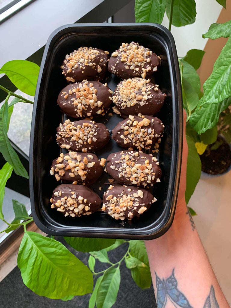 Datte Medjool, chocolat noir, beurre d'arachide, arachide rôtie et sel de l'Himalaya
